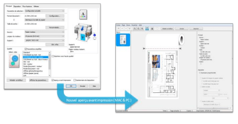 Toujours réussir ses impressions : Le pilote intègre des modes prédéfinis spécialement conçus selon les métiers, son aperçu avant impression permet de garantir une sortie imprimée sans erreur. Ces fonctionnalités sont disponibles à la fois sur plateformes MAC et PC .