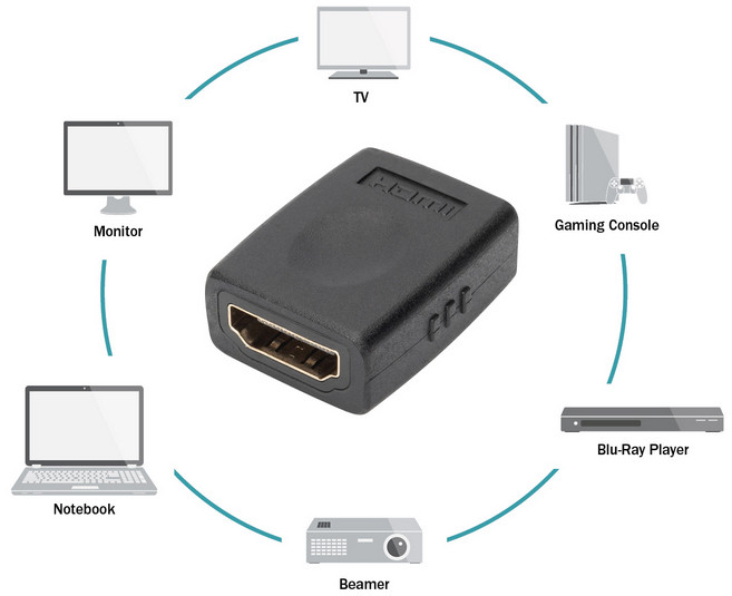HDMI-A Kupplung - HDMI-A Kupplung, 4K/Ultra HD und 3D, tauglich, Kontaktoberfläche: vernickelt, einfach geschirmt,, Haube: vergossen, (AK-330500-000-S),