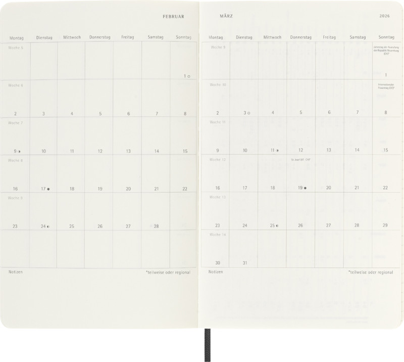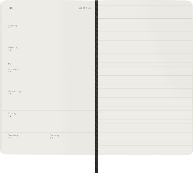 Wochenkalender, Maße: 130 x 210mm, 1 Woche = 1 Seite, rechts, linierte Seite, weicher Einband, abgerundete Ecken, elfen-, beinweißes Papier, 70 g/qm, säurefrei, mit Gummiband zum, Verschließen, Lesezeichen, Sprache: deutsch, 72 Blatt, (8056999274719)