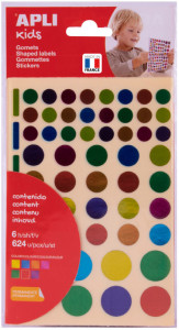 en papier, permanent, 6 feuilles, 104 gommettes par feuille,, assorti dans les couleurs métalliques: jaune, orange, rouge,, rose, vert, bleu, violet, assorti dans différents diamètres, contenu: 624 gommettes, (13529)