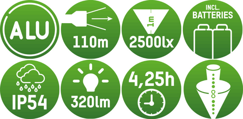 flux lumineux: 320 lumen, durée d'éclairage: 7 heures,, portée lumineuse: 110 m, luminosité: 2.500 lux, système de, mise au point en continu, 2 modes d'éclairage: 100%/40%,, corps en aluminium aéronautique avec finition mat,, (1600-0202)