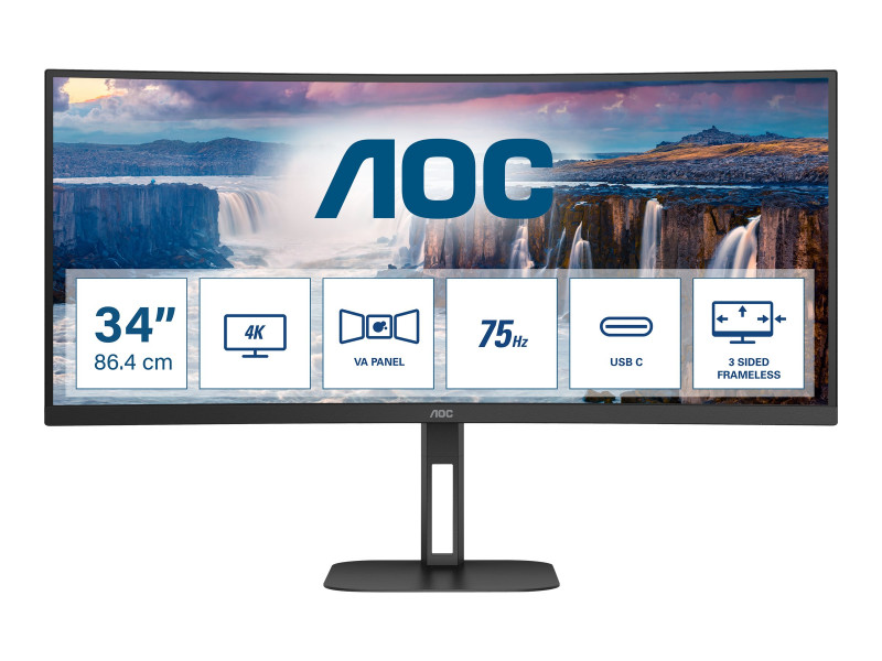 AOC Value-line CU34V5C/BK - V5 series - écran LED - incurvé - 34" - 3440 x 1440 WQHD @ 100 Hz - VA - 300 cd/m² - 3000:1 - 4 ms - HDMI, DisplayPort, USB-C - haut-parleurs - noir mat
