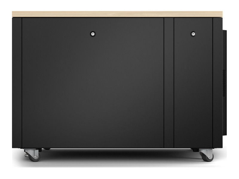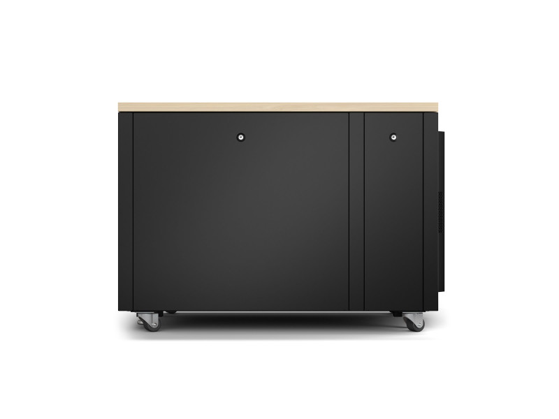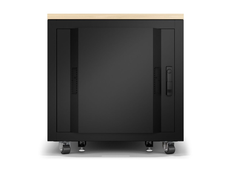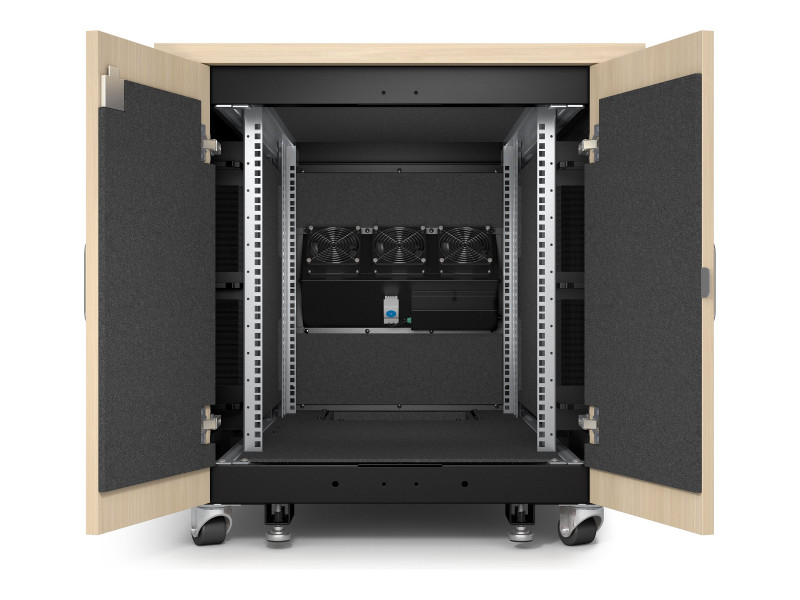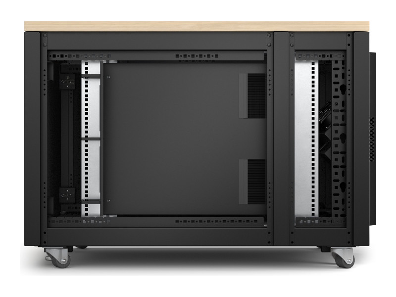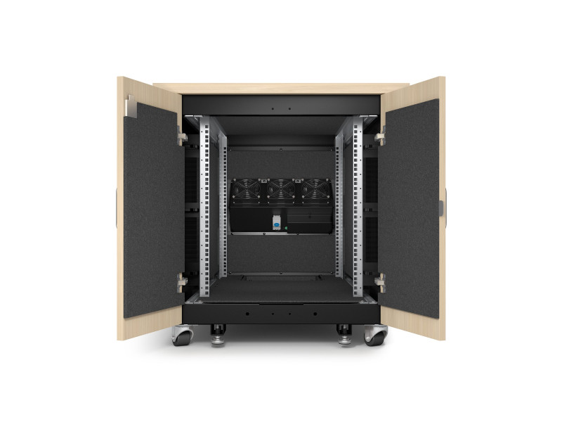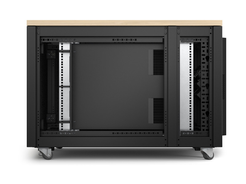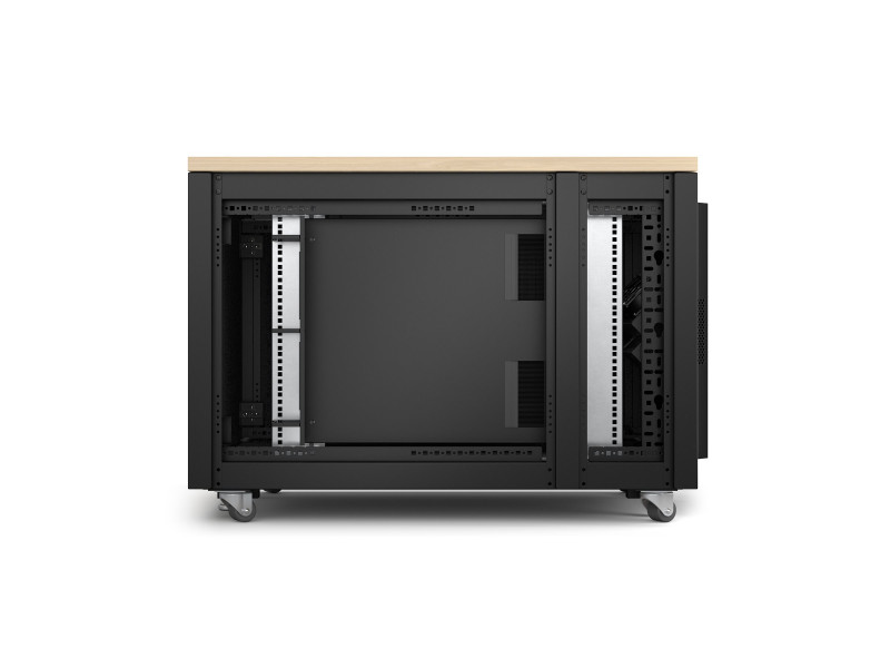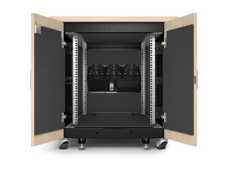 AR4012A finition érable est entièrement prémonté, il se compose d'une armoire, de modules de ventilation, de pieds réglables, de roulettes, d'un bandeau de 4 prises C13 et d'une connexion d'entrée C14.