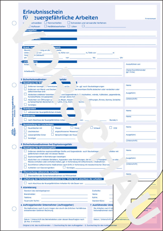 ------------------- für den Markt: D -----------------------, DIN A4, selbstdurchschreibend, 3 x 40 Blatt, für Arbeiten, erforderlich, bei denen mit offener Flamme gearbeitet wird, oder durch Hitze bzw. Funken eine Brandgefahr besteht, (1787)