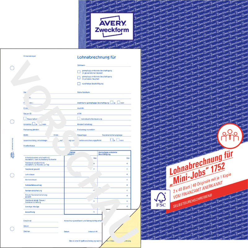 ---------------- für den Markt: D / AT ---------------------, für geringfügige Beschäftigung (Mini-Job), 2 x 40 Blatt,, DIN A4, selbstdruchschreibend, Abgaben-Tabelle der aktuellen, Sozialversicherungs-Beiträge, (1752)