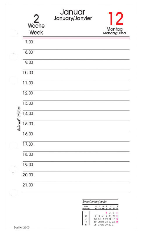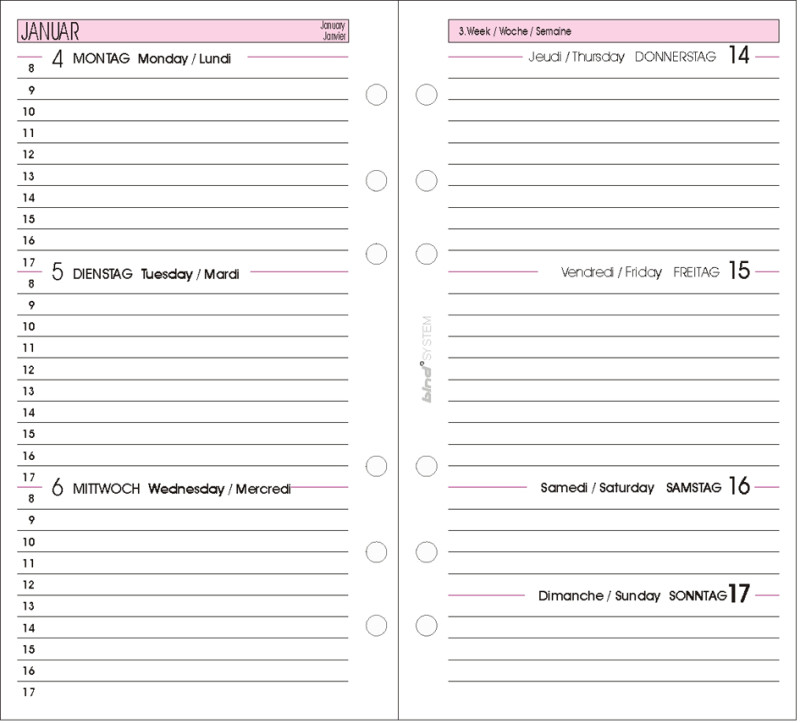 pour modèle T1/T10/T50/10100/10101/10603/16500,, calendrier journalier: 1 jour sur 1 page, aperçus de mois, avec couleurs d'impression: noir / rose, 3 langues:, allemands, anglais, francais, (B260327)