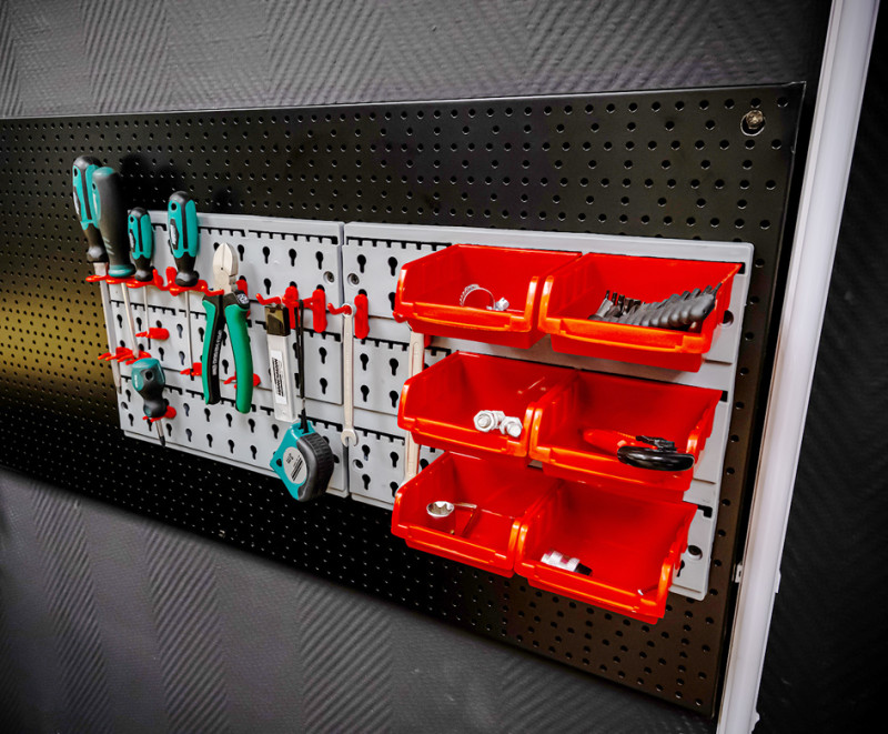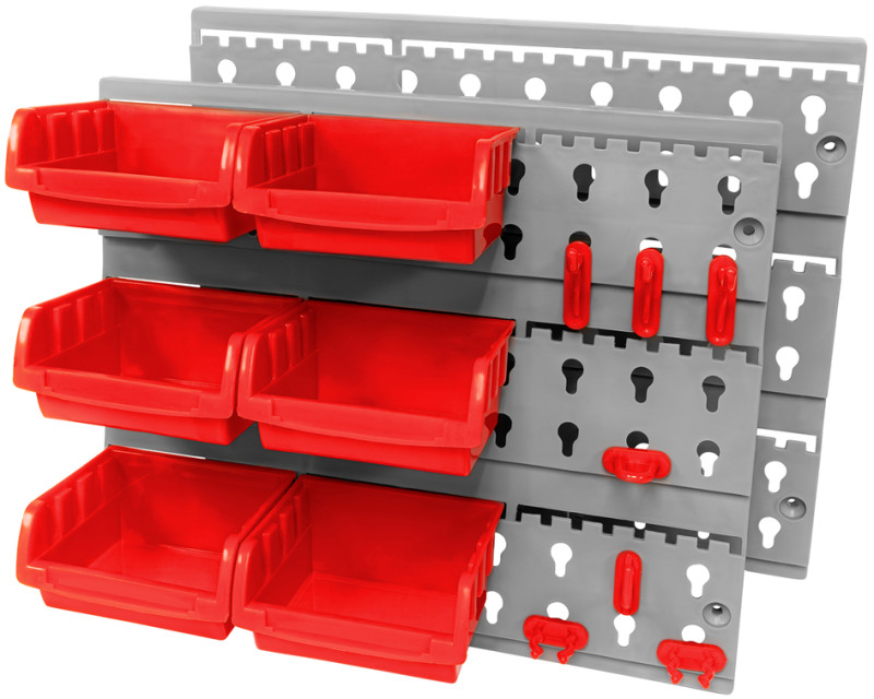 für die Wandmontage, aus Kunststoff, 32-teilig,, bestehend aus: 6 roten Sichtboxen (100 x 100 x 50 mm),, 24 roten Werkzeugaufnahmen, 2 grauen Rückwänden &, Befestigungsmaterial, (M41560)
