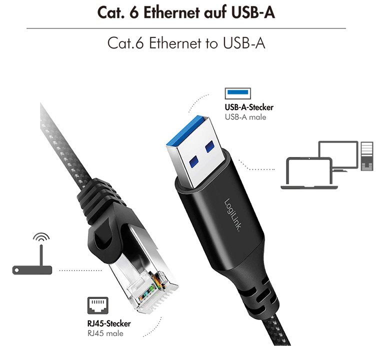 Anschluss: USB-A Stecker - RJ45 Stecker, entspricht USB, SuperSpeed, Kabel entspricht KAT.6 S-FTP Version mit einer, Datenrate bis zu 1 GBit/Sek., geschirmt, Aluminium-Gehäuse,, Stecker vernickelt, Farbe: schwarz/grau, (CU0405)