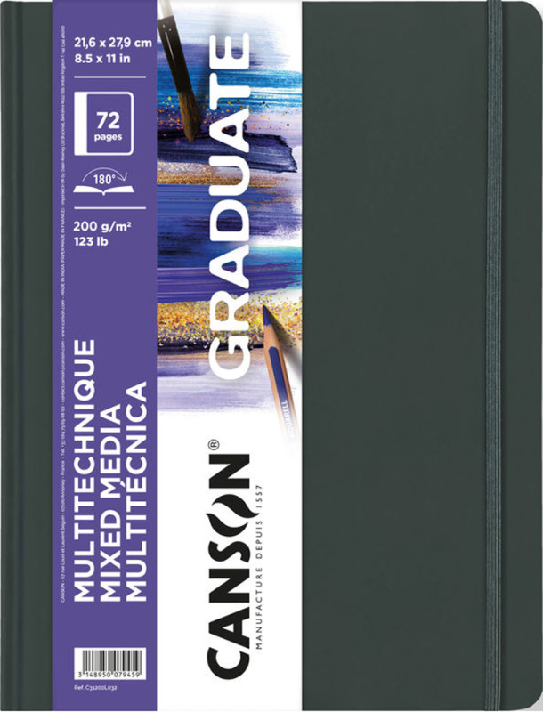 140 x 216 mm, 72 pages, papier 200 g/m2 , papier blanc,, couverture rigide cousue au fil, cousu sur le côté long,, bande de fermeture élastique, pochette intérieure à soufflet, convient pour les techniques mixes, (C31200L030)