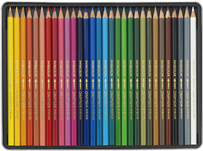 Etui de 30: assorti dans les couleurs jaune citron, orange, saumon, carmin, écarlate, pourpre, violet, bleu outremer, bleu de cobalt, bleu clair, vert jaune, vert émeraude, ocre, brun, noir, gris, blanc, rouge orange, rouge anglais, rose, pourpre clair, bleu, vert malachite, vert prairie, vert foncé, vert kaki, olive noir, brun vandyck, gris noir