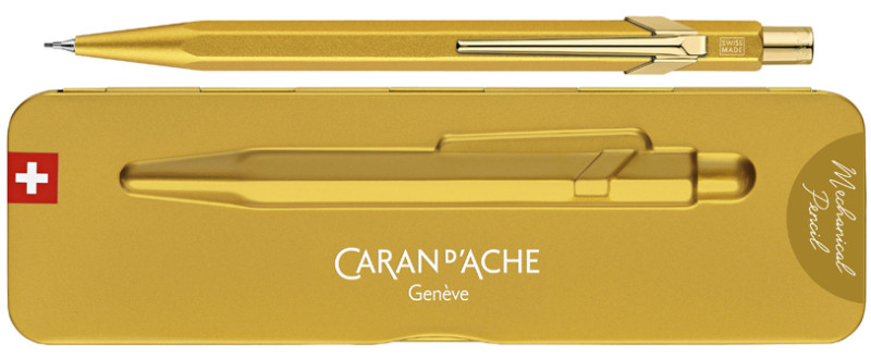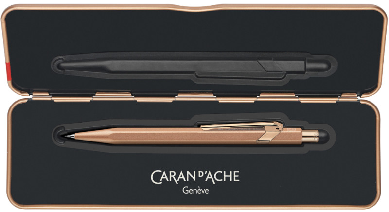 corps hexagonal en aluminium, finition or rose, clip en, métal flexible, bouton poussoir en métal avec gomme et, réservoir de mines intégré à l'arrière, 3 mines HB incluses,, dans un étui extra plat en métal avec fermeture magnétique, (844.997)