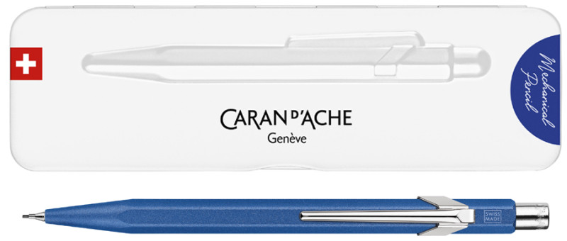 corps hexagonal en aluminium, finition satinée, clip en, métal flexible, bouton poussoir en métal avec gomme et, réservoir de mines intégré à l'arrière, 3 mines HB incluses,, dans un étui extra plat en métal avec fermeture magnétique, (844.681)