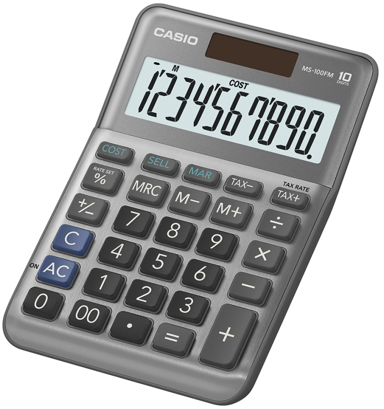 affichage LC, fonctionnement solaire et à pile,, opérations arithmétiques de base, changement de signe, cal-, cul des pourcentages, fonction mémoire, calcul de taxes,, calcul du bénéfice (coût/vente/marge),, (MS-100FM)