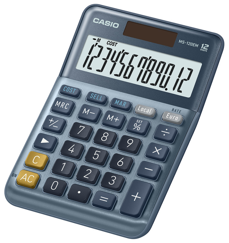 affichage LC à 12 chiffres, fonctionnement solaire et à pile, opérations arithmétiques de base, changement de signe, cal-, cul des pourcentages, fonction mémoire, calcul du bénéfice, (coût/vente/marge), conversion en euro,, (MS-120EM)
