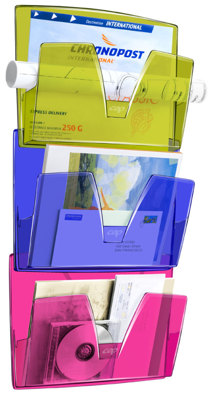 multicolore, en polystyrène, munis d'échancrures sur les, côtés adaptés pour format A3, se fixent en grappe ou séparé-, ment, matériel de montage inclus, dimensions d'une corbeille: 361 x 86 x 270 mm, (170 / 1001700811)