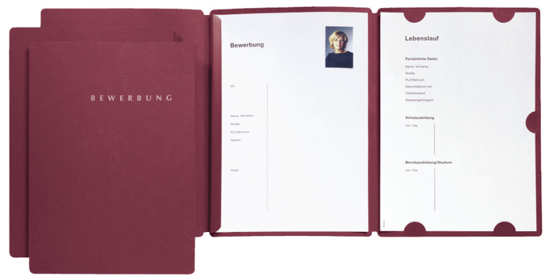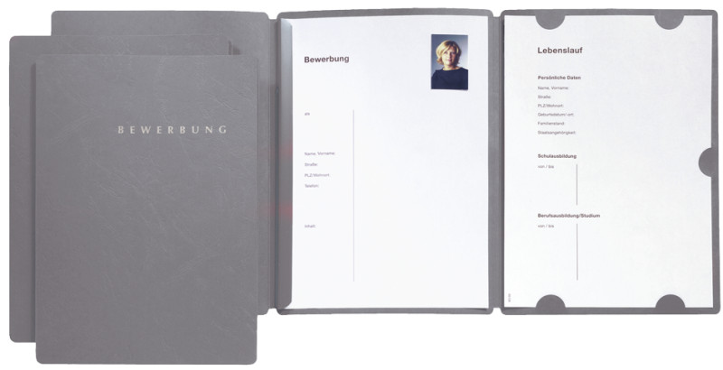 ------------------ für den Markt: D / L / A / CH -----------, 3-teilig, Schriftzug 'BEWERBUNG' auf dem Vorderdeckel,, Klemmschiene für die Aufnahme von Anschreiben,, mit Halbmondstanzungen, (22002-02)
