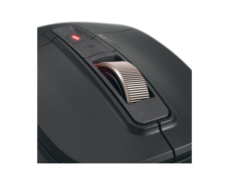 4 niveaux DPI, interrupteur DPI, compartiment de stockage du récepteur, bouton marche-arrêt, indicateur à LED, repose-pouce, poignée avec pouce caoutchouté, batterie rechargeable