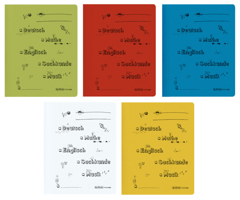 Manilakarton, Beschriftungslinien, gebrauchsfertig gefaltet,, für kaufmännische- u. Behördenheftung, mit Aufdruck: Mathe,, Deutsch, Englisch, Sachkunde, Musik, blauer Engel, gepackt zu 5 Stück, (11253820-000)