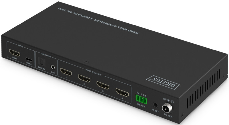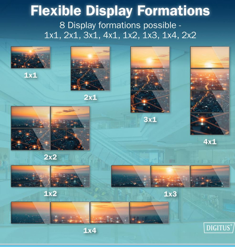 Videowand aus 4 zusammengeschalteten 4UK UHD Displays,, 8 Formationen möglich, Eingangssignal über HDMI (DMI 2.0), oder USB-C (DP 1.2a), max. Auflösung 4K/60Hz, Metall-Gehäuse, Maße: (B)220 x (T)100 x (H)30 mm, Gewicht: 590 g, (DS-55358)