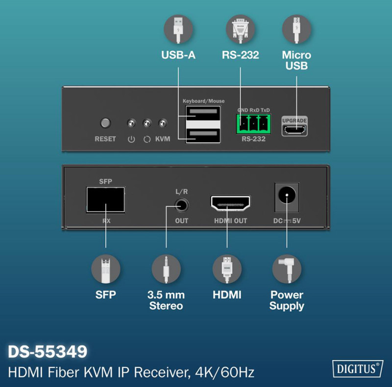 Erweiterung für Extender Set DS-55348 für Zuschaltung, mehrerer Displays, HDTV Auflösung max: 3.840 x 2.160 Pixel,, HDTV Standard: Ultra HD 4K, KVM, Reichweite: 40.000 m,, Übertragungstechnik: Fiber, Maße: (B)103 x (T)106 x (H)26 mm, (DS-55349)