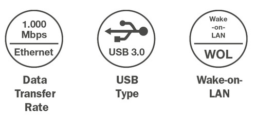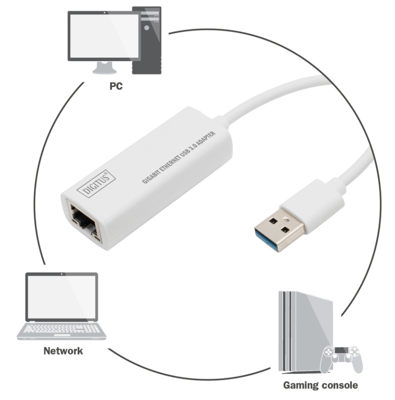 connecteur USB 3.0, 1x fiche femelle RJ45, 1x fiche USB-A, mâle, IEEE 802.3/802.3u/802.3ab/802.3az (10Base-T/100Base-T/, 1000Base-T) compatible, supporte Wake-On-LAN, fonctionne à , partir de Windows 7/Vista/XP, Mac OS 10.6/10.7, (DN-3023)