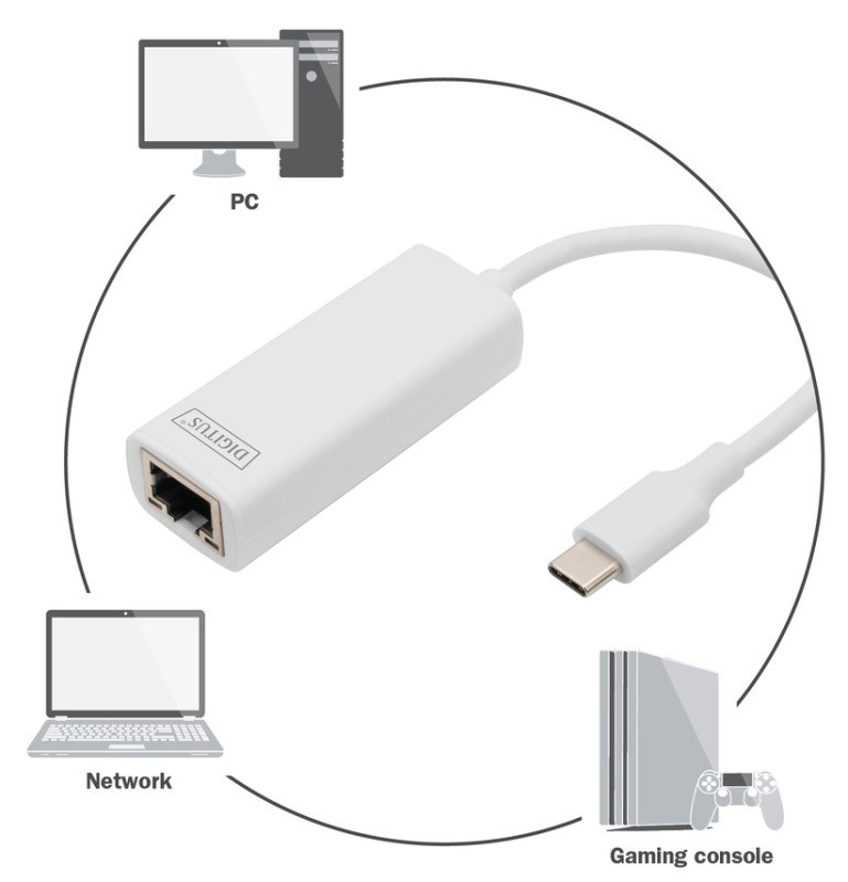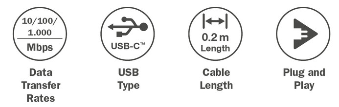 connexion USB 3.0, 1 x port RJ45, 1 x connecteur USB-C, 10/100/1.000 MBit/sec., boîtier en aluminium de haute, qualité, chipset: RTL8153, longueur de câble: 200 mm, (DN-3024),