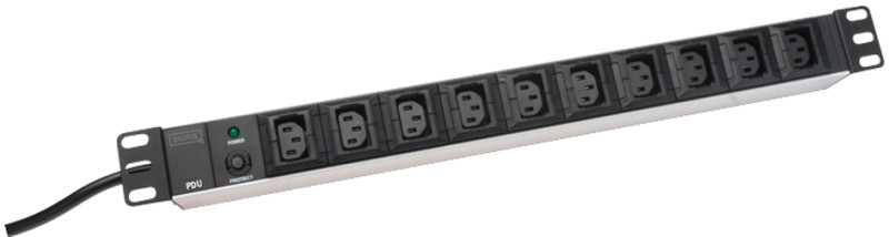 1U, IEC C13, 10 A / 2500 Watt, 250V, fiche IEC C13 mâle, comme amenée, câble de 2,0 m de modèle H05VVF3G1, 5qmm,, 2 x supports métaliques 19" , boitier aluminium noir,, dimensions: (L)465 x (P)50 x (H)50 mm, avec 4 vis de montage, (DN-95404)