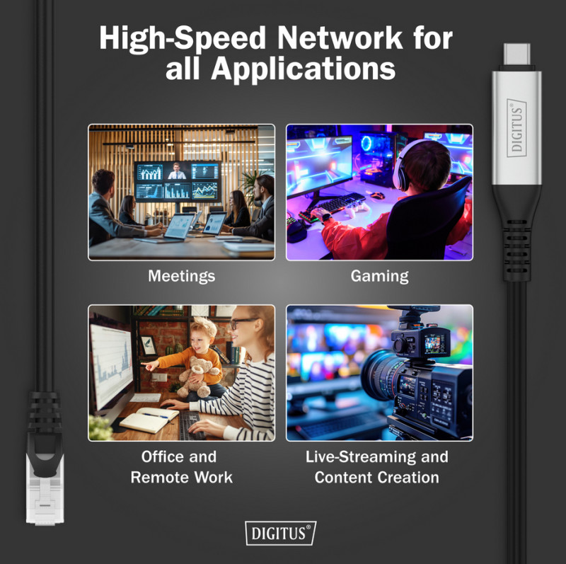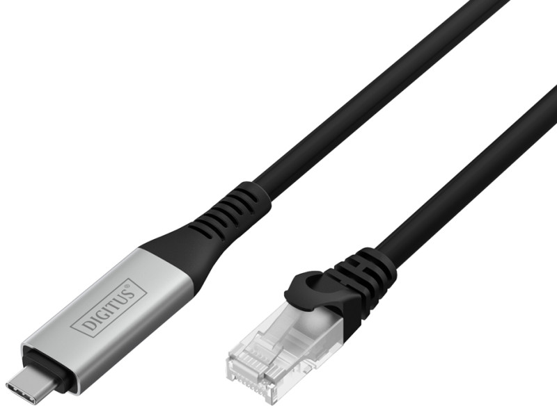 couleur: noir, connexion: USB-C mâle - RJ45 mâle, vitesse:, 10/100/1000 Mpbs, cat. 6A S/FTP, version USB: USB 3.2 Gen1,, rétrocompatible, Plug & Play, boîtier aluminium, diamètre, extérieur: 6,2 mm, (AK-300601-150-S)