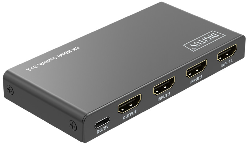 3 sources de signal jusqu'à l'écran via 1 connexion HDMI,, alimentation électrique via câble USB-C, résolution max.:, 8K/60Hz, bande passante vidéo: 48 Gbps, HDMI 2.1, 3 entrées, HDMI, 1 sortie HDMI, 1 entrée USB-C (alimentation), (DS-55333)