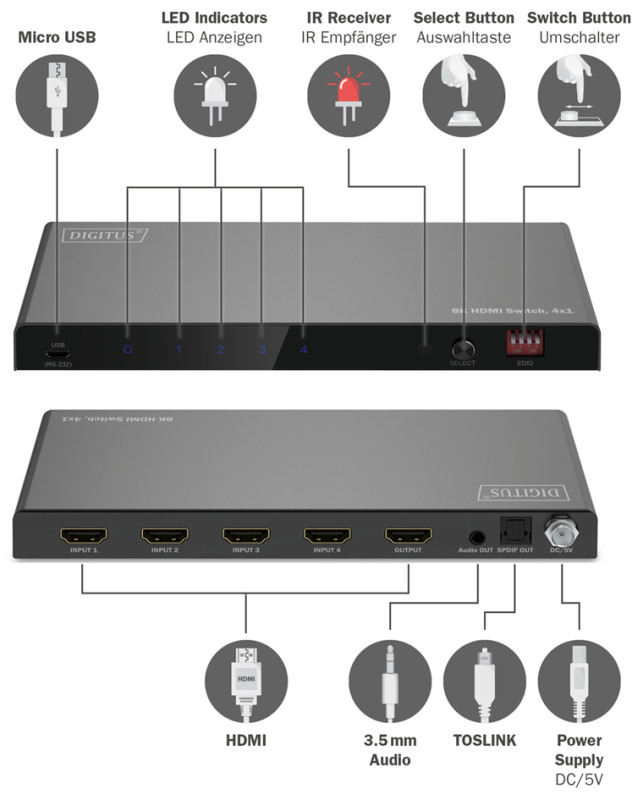 4 sources de signal jusqu'à l'écran via 1 connexion HDMI,, connexions: 4x entrée HDMI, 1x sortie HDMI, 1x entrée Micro, USB, 1x DC femelle (alimentation électrique), 8x voyant LED,, 1 commutateur, 1 récepteur, dim.: 188 x 71 x 18 mm, (DS-55335)
