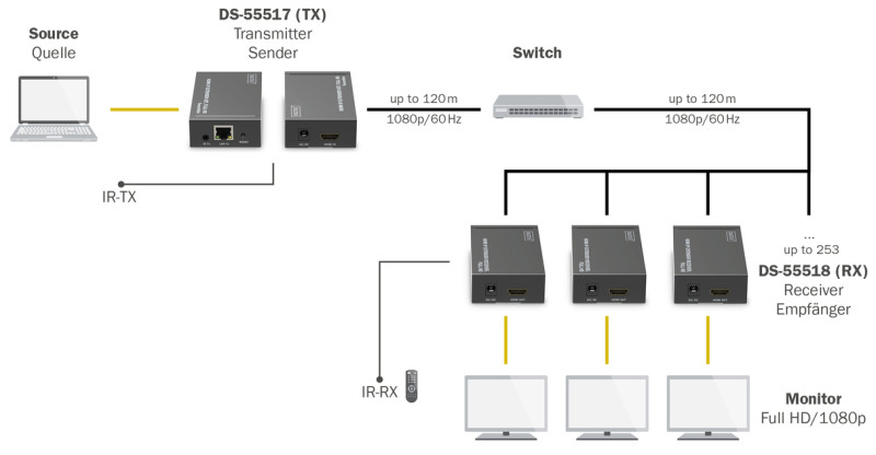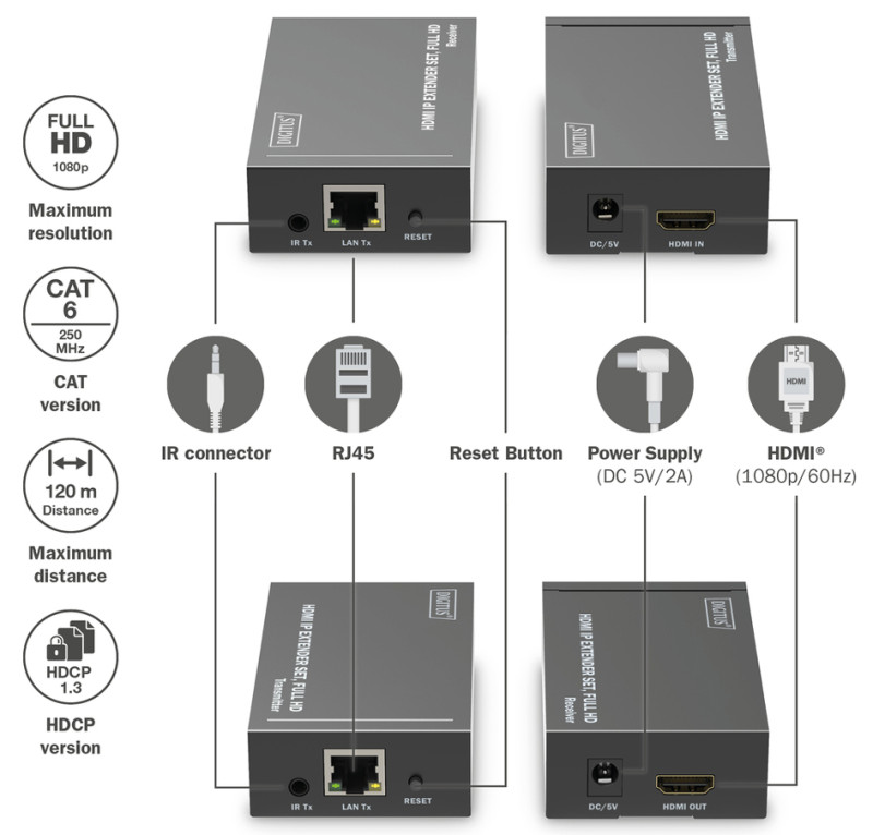 ports unité d'émission: 1x entrée HDMI, 1x sortie RJ45,, 1x sortie IR, 1x entrée bloc d'alimentation, 1x touche de, réinitialisation, ports de l'unité réceptrice: 1x sortie, HDMI, 1x entrée RJ45, 1x entrée IR,, (DS-55517)