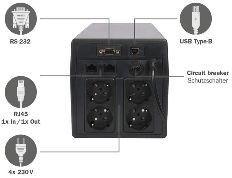 ------------------ pour le marché: D / F / NL / A / L ------, 230V/50Hz, 162-290V, sorties: 4x fiche de sécurité, 2x RJ45,, 1x port USB B femelle, 1x RS-232 femelle, fonctions, démarrage à froid & économie d'énergie, protection contre, courts circuits et surtension, écran LCD