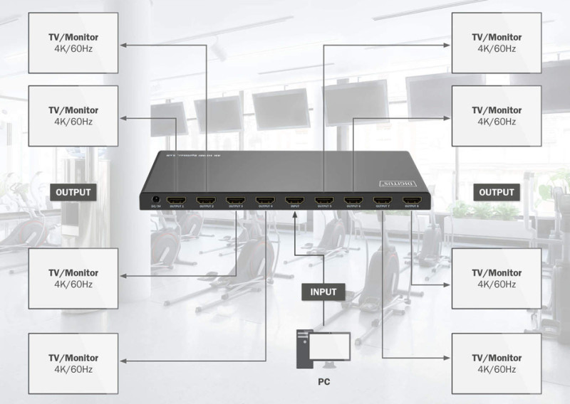 distribue le signal HDMI sur 8 TV/écrans/vidéoprojecteurs,, management EDID, alimentation via cordon micro USB, bande, passante vidéo: 18 Gbps, HDMI 2.0, 1 entrée HDMI, 8 sorties, HDMI, 1 entrée réseau, LED de statut, adaptateur secteur, (DS-55338)