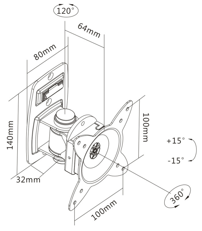 adapté pour moniteurs de 68,58 cm (27"), capacité de charge:, 15 kg, VESA standard: 75 x 75 / 100 x 100 mm,, inclinaison: +/- 15 degrés, rotation: 360 degrés,, poids: 0,8 kg, dimensions:: (L)80 x (P)64 x (H)140 mm, (DA-90350)