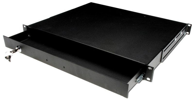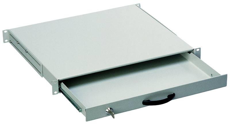 (RAL 7035), fixation aux cornières, verrouillable, ouvrable, acier robuste avec une grande charge, recouvert de poudre,, capacité de charge: 25 kg, dimensions interieures: (L)420 x, (P)400 x (H)44 mm, dimensions extérieures: (L)420 x (P)390 x, (H)34 mm (DN-19 KEY-1U)