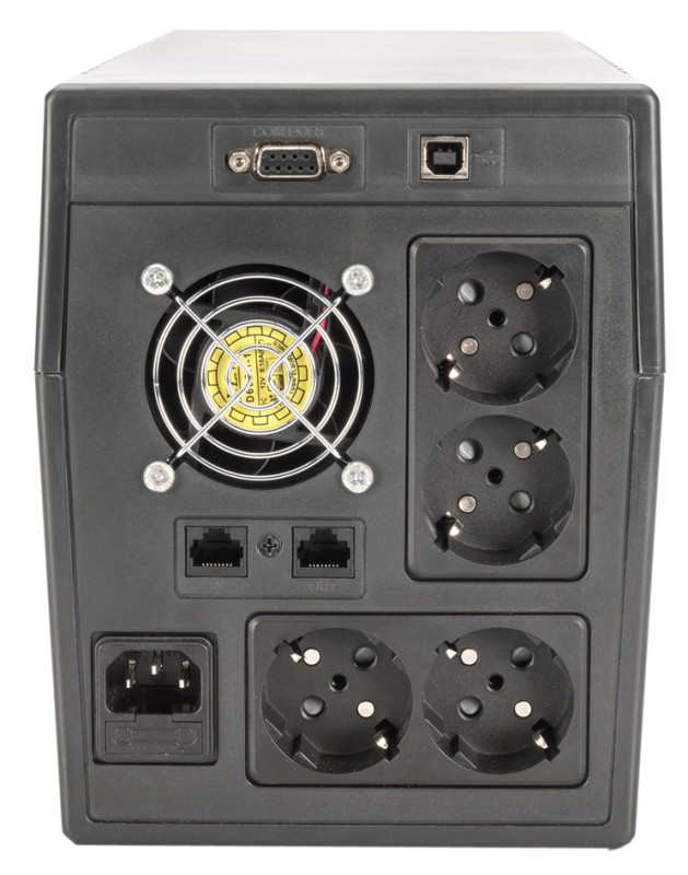 230V / 50Hz, 145-290V, des bornes de sortie: Contact 4x de mise à la terre, 2x RJ45, embrayage USB 1x B, 1x RS-232, 1x USB 2.0 de type B, la fonction de démarrage à froid, surcharge, décharge et les surcharges, protection, LCD Disp