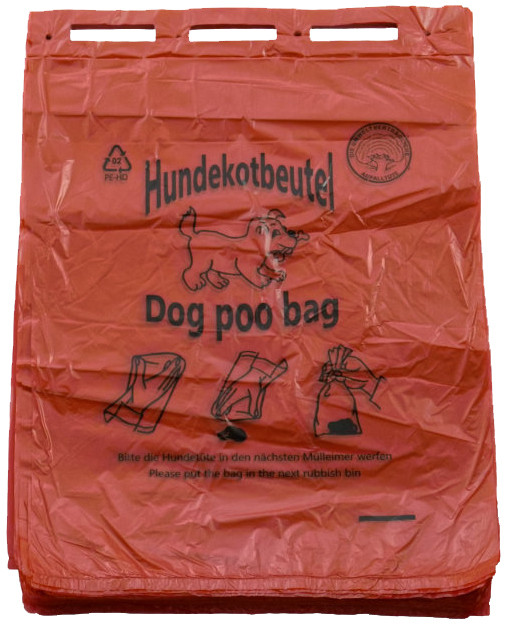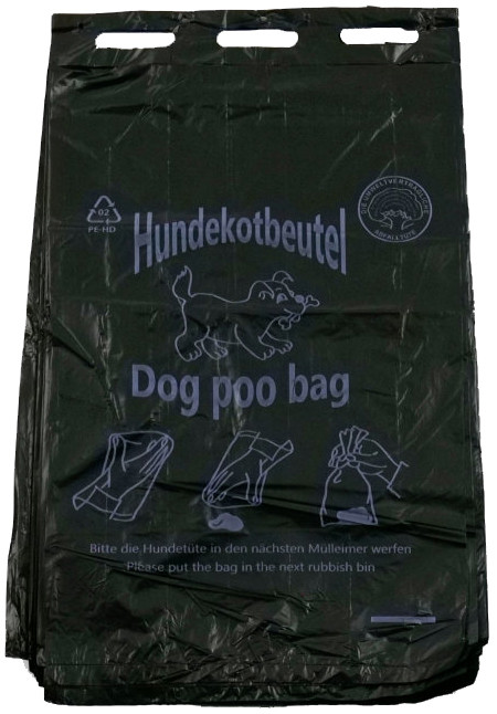 Maße: (B)250 x (T)30 x (H)310 mm, schwarzer Aufdruck:, "Hundekotbeutel" und "Dog poo bag", 30 mm Blockrand mit 3, Langlöchern, aus 95% HDPE-Recyclingmaterial,, beinhaltet: 100 Stück, (15420012 / 79100166)