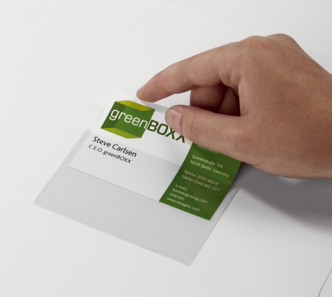 couleur: transparent, en film souple, ouverture latérale, épaisseur: verso: 0,25 mm, recto: 0,10 mm, verso adhésif, en format de cartes de visite, contenu: 100 pièces, étiquettes unies incluses, (8279-19)