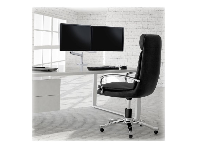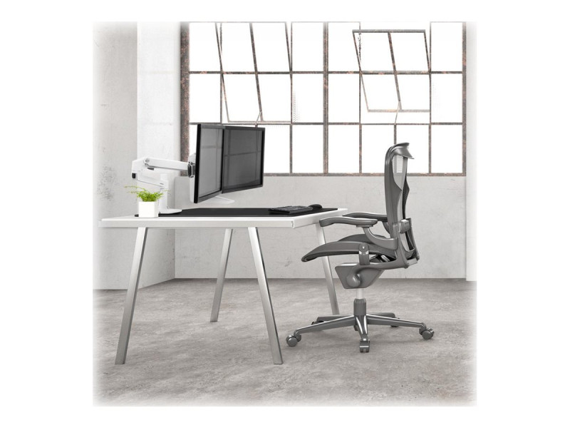 Créez une configuration bi-écrans juxtaposés accessible à tous, entièrement réglable et permettant de libérer un maximum d'espace sur le bureau. Repositionnez vos écrans LCD d'une simple pression. Vers le haut. Vers le bas. En avant. En arrière. La barre transversale au profil fin permet un éventail de mouvements qui convient à la plupart des bureaux.
