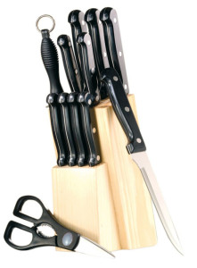 Klingen aus Spezialstahl, schwarze ABS-Griffe, Set, bestehend aus: je 1 Brotmesser, Kochmesser, Fleischmesser,, Schinkenmesser, Schälmesser, Gemüsemesser, Wetzstahl,, Haushaltsschere und 4 Steakmesser, (291-081)