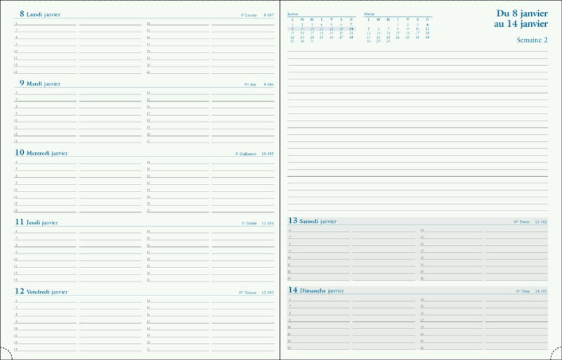 210 x 270 mm, 1 semaine sur 2 pages, janvier à décembre,, couverture PVC lisse Barbara, papier ivoire, tranche, naturelle, répertoire, espace de notes, (274721E),
