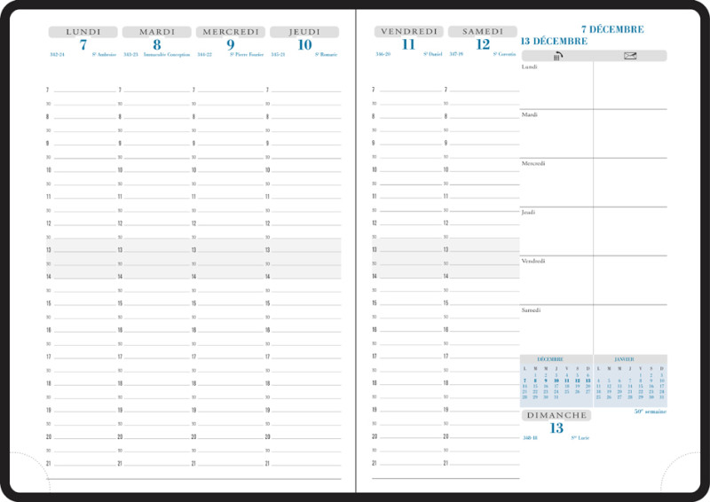 150 x 210 mm, 1 semaine sur 2 pages, janvier à décembre,, couverture Barbara PVC lisse, broché, tranche naturelle,, papier azur, répertoire, assorti en noir, bleu, rouge, en paquet de 3 pièces, (204421E)