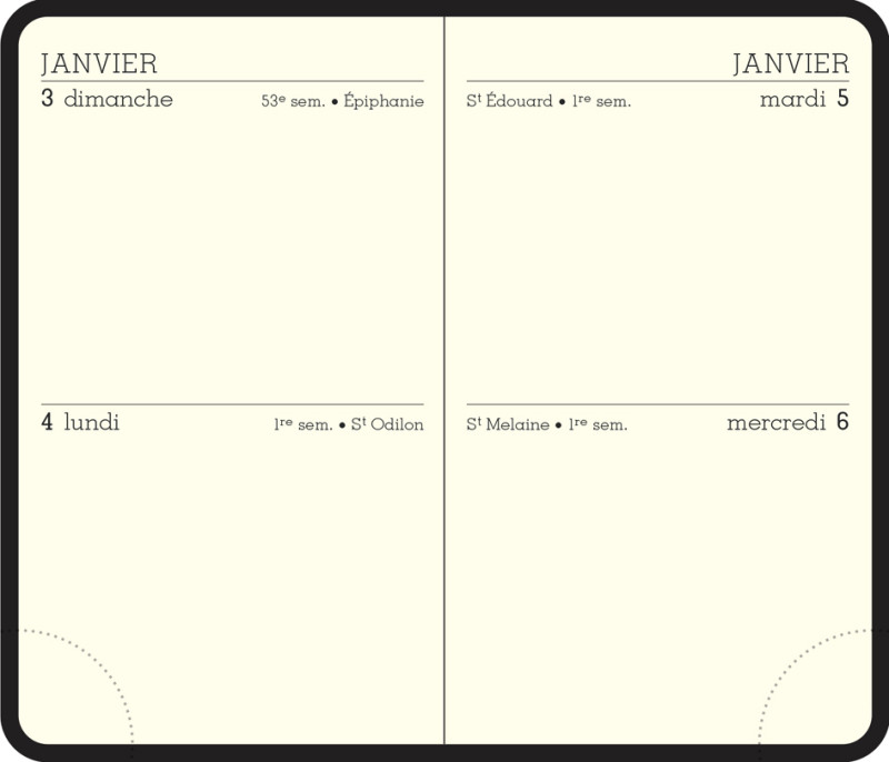 75 x 115 mm, 2 jours à la page, couverture Winner PVC lisse, toucher doux, papier ivoire, tranche or, fermoir doré,crayon, assorti en noir, rouge, bleu canard, avec répertoire, en paquet de 5 pièces, (11421E)