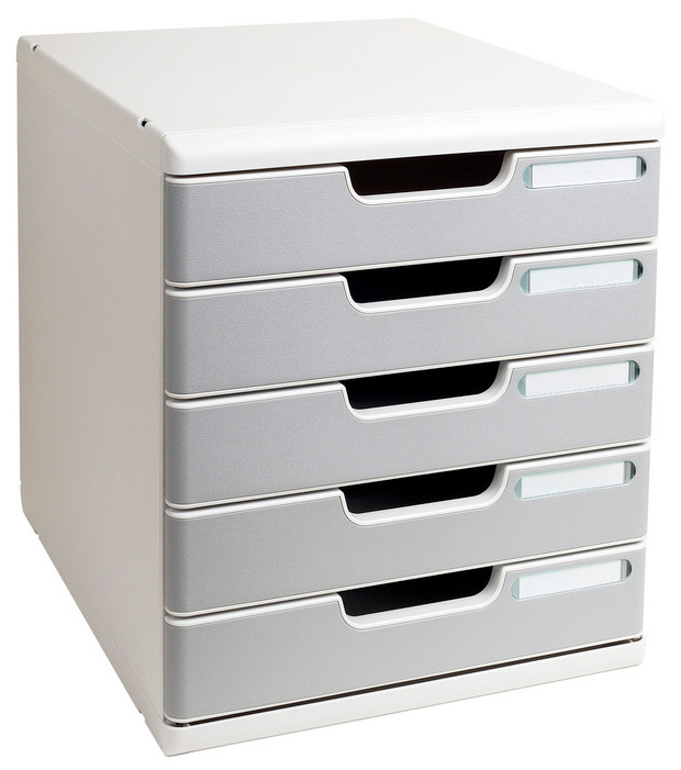 corps en polystyrène, pour format A4+, tiroirs avec butée de, sécurité, échancrure pratique, superposable, dimensions: (L)288 x (P)350 x (H)320 mm, corps: gris clair, tiroirs: bleu, (302003D)