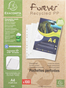 en PP recyclé, épaisseur: 60 microns, ouvert en haut,, perforation euro, contenu: 100 pochettes, (5320E),