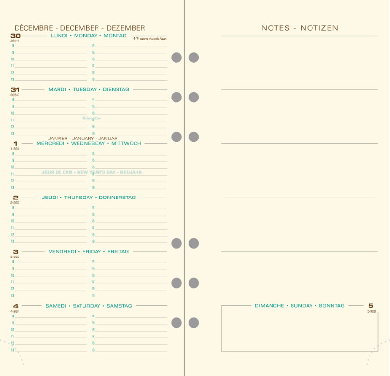 --------------------- Pour le marché F --------------------, semainier millésimé, 1 semaine sur 2 pages avec notes,, papier ivoire, format: 170 x 92 mm horizontal, (18644E),