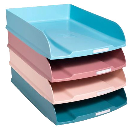 en polystyrène, superposable à la verticale et en escalier,, assorti dans les couleurs nude, bleu givré, bleu pacifique,, vieux rose, dimensions: (L)254 x (P)243 x (H)346 mm, contenu: 4 corbeilles à courrier, (111606SETD)