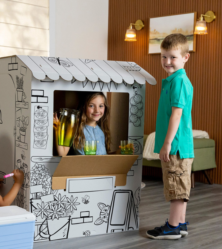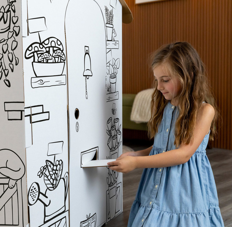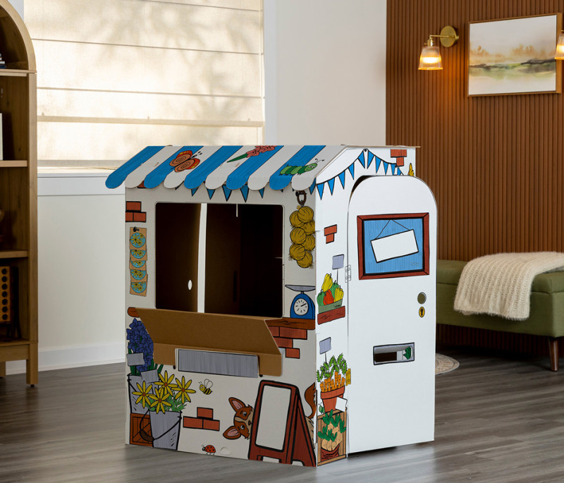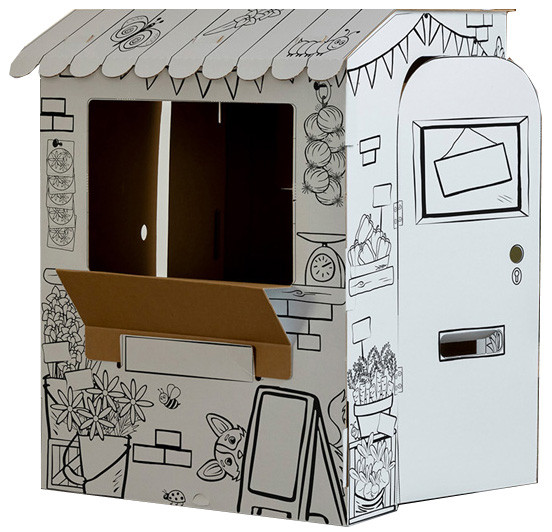 mit abgerundenten Kanten, schnell und ohne Klebstoff, aufzubauen, mit vorgedruckten Motiven, recycelbar,, Türen & Fenster können geöffnet & geschlossen werden,, Maße: aufgebaut: (B)816 x (T)930 x (H)1.066 mm, (100142507)