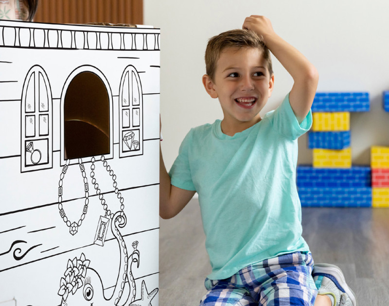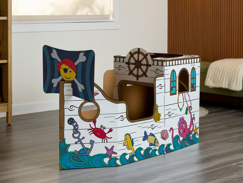 mit abgerundenten Kanten, schnell und ohne Klebstoff, aufzubauen, mit vorgedruckten Motiven, recycelbar,, Türen & Fenster können geöffnet & geschlossen werden,, Maße: aufgebaut: (B)505 x (T)790 x (H)1.350 mm, (100142508)