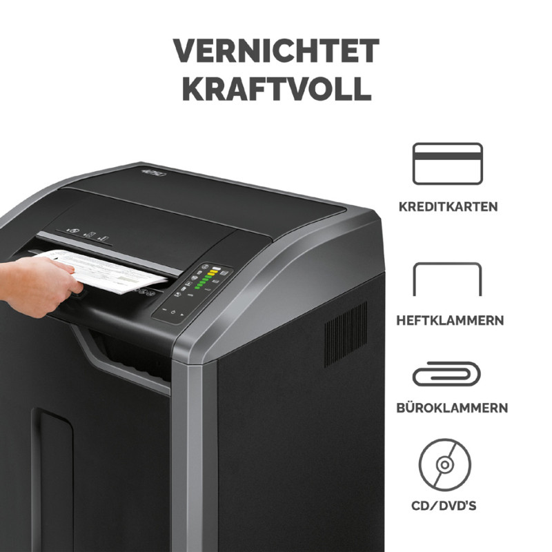 -------------------- pour le marché: CH --------------------, 4 x 30 mm, capacité de coupe: 30-32 feuilles, corbeille:121l, entrée: 305 mm, détruit CDs/cartes de crédits/agrafes et, trombones, sécurité: P-4/0-3/T-4, noir/argent, dimensions:, (L)559 x (P)508 x (H)965 mm, fiche CH (4698801)
